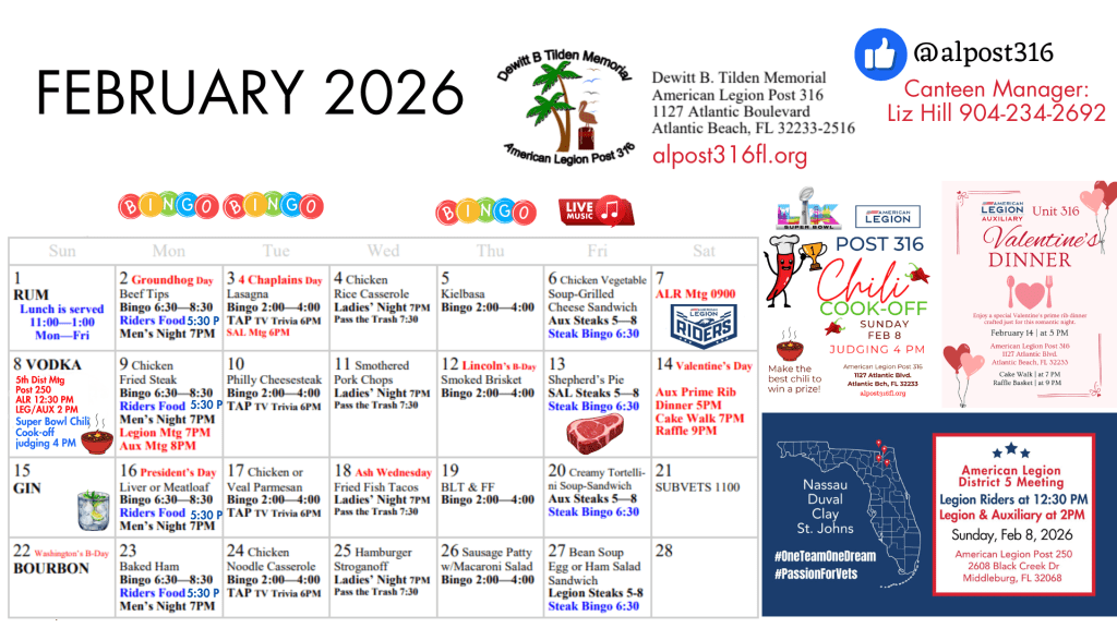 American Legion Post 316 is a service organization comprised of wartime-serving veteran’s located in Atlantic Beach, FL. The American Legion is the nation’s largest wartime veteran’s service organization, committed to mentoring youth and sponsorship of wholesome programs in our communities, advocating patriotism and honor, promoting strong national security, and continued devotion to our fellow service-members and veterans. Post 316 is also committed to working with to improve our community.