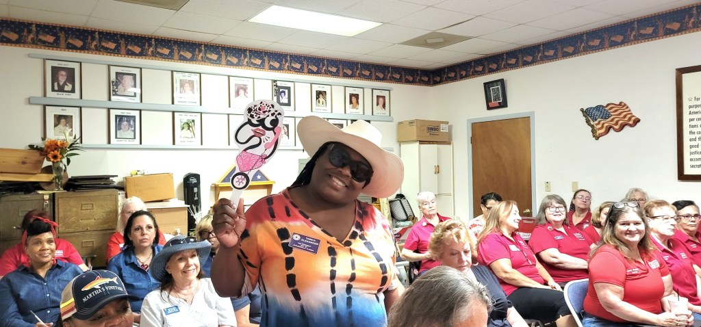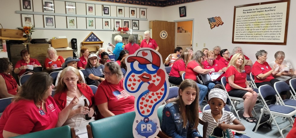 August 10, 2025 – American Legion Auxiliary 5th District Meeting, we are the telephones. Reach out. Reconnect. Reignite. The paper question mark is Que, and the Florida Leadership wants us to share photos and follow Que on her quest for knowledge. Because learning is leading.